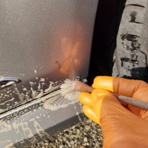 細かい場所ですとポリッシャーでは磨けず、細かなディテールブラシやスポンジを使って洗剤、溶剤にて汚れを落とします。