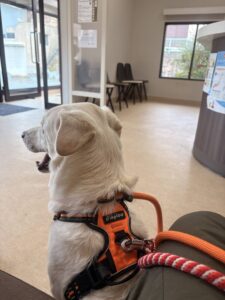 動物病院に入ったら、いつもすぐにイスの下に隠れる疾風くん(32キロ)